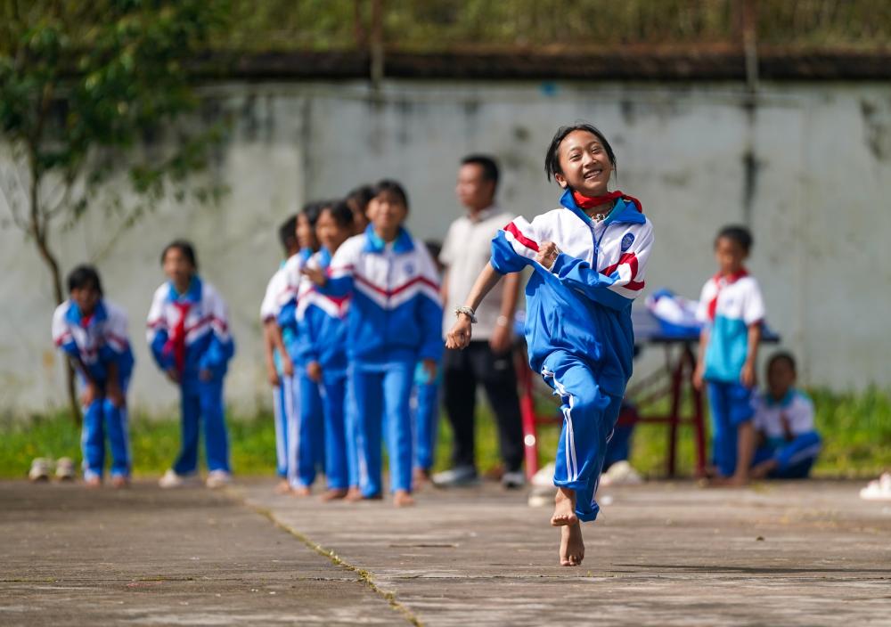 在云南省普洱市孟連傣族拉祜族佤族自治縣,臘福小學(xué)學(xué)生課間在操場(chǎng)進(jìn)行奔跑接力比賽(2025年9月15日攝)。新華社記者 陳欣波 攝