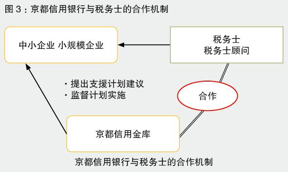 從2012年8月開始,日本政府實施“認(rèn)定中小企業(yè)經(jīng)營革新支援機關(guān)”制度:由經(jīng)濟產(chǎn)業(yè)省通過接受申報,主持考試、審查認(rèn)證,授權(quán)從事中小企業(yè)經(jīng)營革新的支援機構(gòu)。到目前為止已認(rèn)定授權(quán)了約2.5萬個中小企業(yè)支援機構(gòu)。它由五類機構(gòu)組成:第一類是商工會、商工會議所、中小企業(yè)團體中央會等商會團體;第二類是稅務(wù)、法務(wù)類支援機構(gòu),主要是稅務(wù)士、會計士、咨詢顧問等專業(yè)咨詢機構(gòu)和專家;第三類是金融機構(gòu);第四類是一些財團法人、社團法人、NPO法人機構(gòu);第五類是其他中小企業(yè)支援機構(gòu)(主要是市町村自治體舉辦的中小企業(yè)支援中心)。通過這些支援機構(gòu)對中小微企業(yè)的免費或有償(政府補貼)輔導(dǎo)、咨詢、支援,提高中小企業(yè)的管理水平,規(guī)范其財務(wù)制度和信息透明制度,盡可能把金融機構(gòu)與中小微企業(yè)之間的信息不對稱降到最低。其中商會組織(商工會議所、商工會)的作用特別明顯,日本政府通過財政補貼,賦予商會對中小微企業(yè)的管理輔導(dǎo)特別是財務(wù)指導(dǎo)的職能,在此基礎(chǔ)上又賦予向金融機構(gòu)推薦融資的職能(見圖2)。比如,日本政策金融公庫有一項專門支持困難企業(yè)改善管理的專項貸款,其前提就是申請貸款的企業(yè)必須至少接受過商會六個月的管理指導(dǎo)。此外,許多商業(yè)銀行在向中小微企業(yè)發(fā)放貸款時常常與相關(guān)會計士、稅務(wù)士等合作,在發(fā)放貸款前,會同這些支援機構(gòu)與申請貸款的企業(yè)共同協(xié)商,并委托參與的支援機構(gòu)負(fù)責(zé)對貸款企業(yè)進行財務(wù)監(jiān)督(見圖3)。
